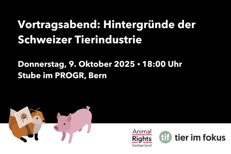Gemeinsam mit Tier im Fokus zeigen wir am Donnerstag, 9. Oktober, in Bern einen Einblick in die Schweizer Tierindustrie. Wir berichten aus der Recherche unserer neuen Kampagne und unsere Freund:innen von Tier im Fokus zeigen ihnen zugespielte Bilder aus der Industrie. Seid dabei!