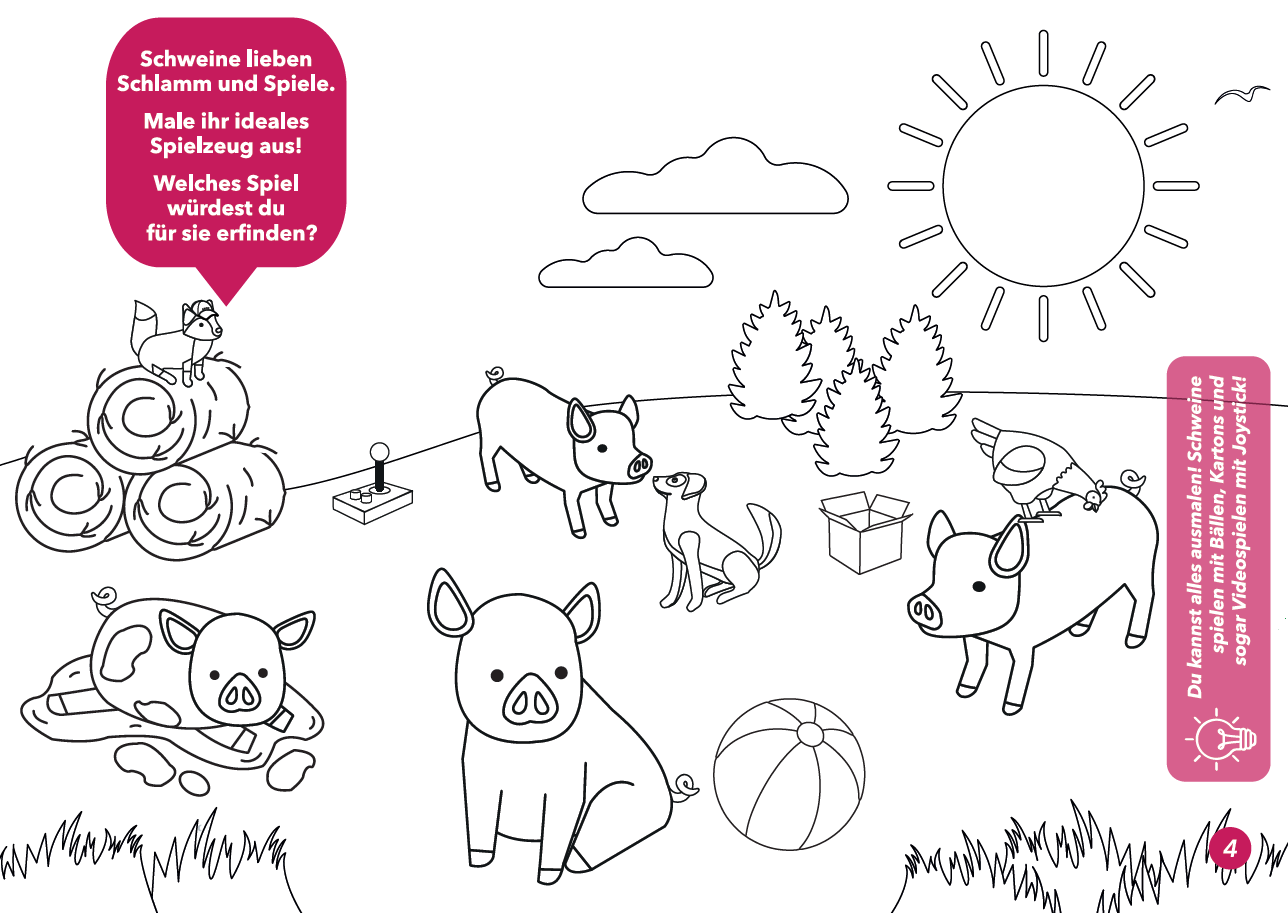 Seid ihr bereit? 20 Seiten voller Mal- und Rätselspass mit Schweinen, Kühen und Schafen sind neu da, um von tierliebenden Kindern befüllt zu werden!